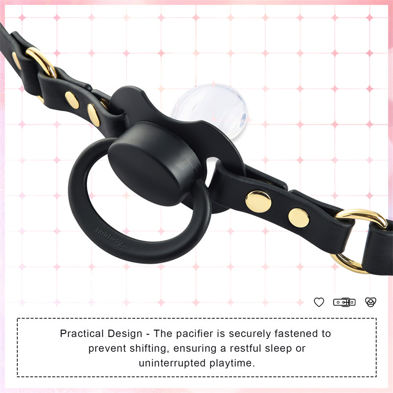 - Premium Materials: Crafted from high-quality, double-layered leather, this pacifier gag offers a luxurious feel while being durable enough to withstand frequent use. The materials are non-toxic and safe for prolonged contact with the skin. The leather is resistant to fading and wear, maintaining its softness and aesthetic appeal even after extended use. The pacifier itself is made from food-grade silicone, ensuring it is safe, hygienic, and easy to clean as well as providing a premium mouth-feel.