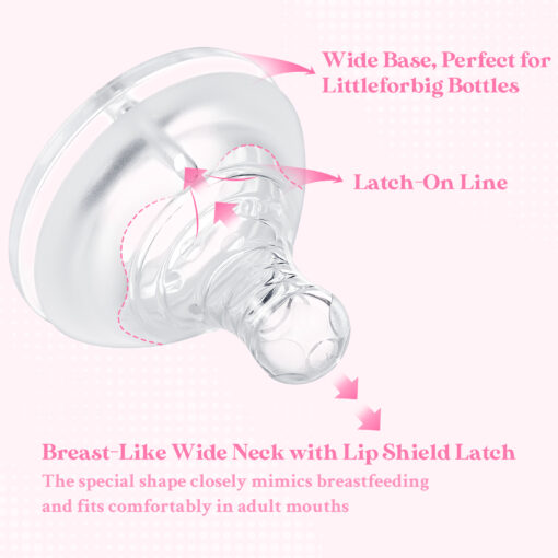 Nappen har en naturlig form och mjuk textur som ligger bekvämt i munnen och efterliknar känslan av amning. Den mäter 4,4 cm lång och 5 cm bred och passar alla standardflaskor med 50 mm bred öppning, inklusive LittleForBig Adult Bottles och liknande modeller. Observera: Flaskor säljs separat.